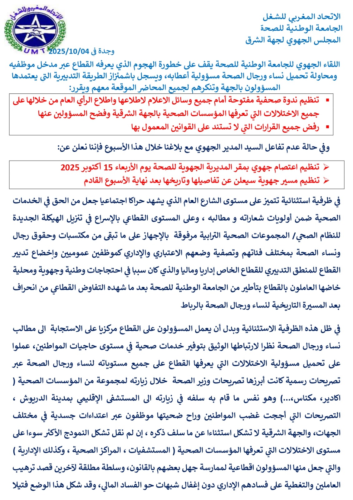 تنظيم ندوة صحفية مفتوحة أمام جميع وسائل الإعلام لإطلاعها وعبرها الرأي العام على جميع الاختلالات التي تعرفها المؤسسات الصحية بالجهة الشرقية وفضح المسؤولين عنها