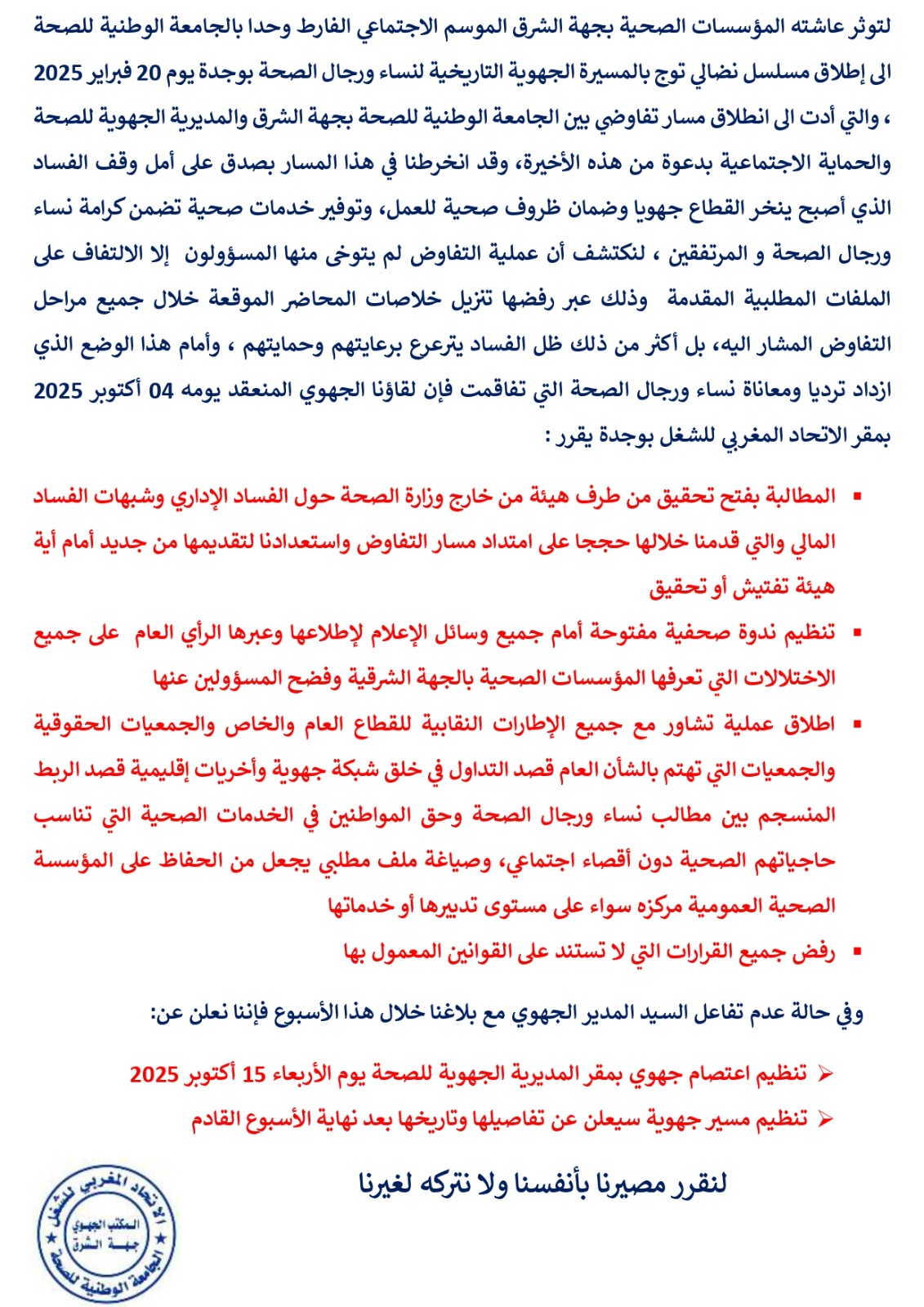 في ظل هذه الظرفية الاستثنائية وبدل أن يعمل المسؤولون على القطاع مركزيا على الاستجابة الى مطالب نساء ورجال الصحة نظرا لارتباطها الوثيق بتوفير خدمات صحية في مستوى حاجيات المواطنين، عملوا على تحميل مسؤولية الاختلالات التي يعرفها القطاع على جميع مستوياته لنساء ورجال الصحة عبر تصريحات رسمية كانت أبرزها تصريحات وزير الصحة خلال زيارته لمجموعة من المؤسسات الصحية ( اكادير، مكناس،…) وهو نفس ما قام به سلفه في زيارته الى المستشفى الإقليمي بمدينة الدريوش ، التصريحات التي أججت غضب المواطنين وراح ضحيتها موظفون عبر اعتداءات جسدية في مختلف الجهات، والجهة الشرقية لا تشكل استثناءا عن ما سلف ذكره ، إن لم نقل تشكل النمودج الأكثر سوءا على مستوى الاختلالات التي تعرفها المؤسسات الصحية ( المستشفيات ، المراكز الصحية ، وكذلك الإدارية ) والتي جعل منها المسؤولون اقطاعية لممارسة جهل بعضهم بالقانون، وسلطة مطلقة لآخرين قصد ترهيب العاملين والتغطية على فسادهم الإداري دون إغفال شبهات حو الفساد المالي، وقد شكل هذا الوضع فتيلا لتوثر عاشته المؤسسات الصحية بجهة الشرق الموسم الاجتماعي الفارط وحدا بالجامعة الوطنية للصحة الى إطلاق مسلسل نضالي توج بالمسيرة الجهوية التاريخية لنساء ورجال الصحة بوجدة يوم 20 فبراير 2025 ، والتي أدت الى انطلاق مسار تفاوضي بين الجامعة الوطنية للصحة بجهة الشرق والمديرية الجهوية للصحة والحماية الاجتماعية بدعوة من هذه الأخيرة، وقد انخرطنا في هذا المسار بصدق على أمل وقف الفساد الذي أصبح ينخر القطاع جهويا وضمان ظروف صحية للعمل، وتوفير خدمات صحية تضمن كرامة نساء ورجال الصحة و المرتفقين ، لنكتشف أن عملية التفاوض لم يتوخى منها المسؤولون إلا الالتفاف على الملفات المطلبية المقدمة وذلك عبر رفضها تنزيل خلاصات المحاضر الموقعة خلال جميع مراحل التفاوض المشار اليه، بل أكثر من ذلك ظل الفساد يترعرع برعايتهم وحمايتهم ، وأمام هذا الوضع الذي ازداد ترديا ومعاناة نساء ورجال الصحة التي تفاقمت فإن لقاؤنا الجهوي المنعقد يومه 04 أكتوبر 2025 بمقر الاتحاد المغربي للشغل بوجدة يقرر :