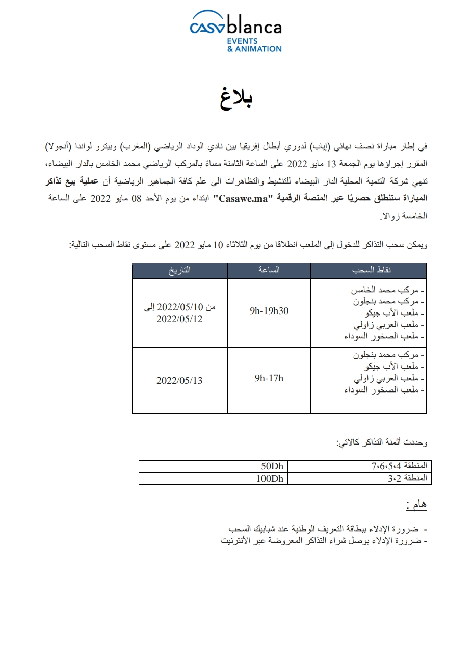 أعلنت شركة “كازا إيفنت” عن انطلاق عملية بيع تذاكر مباراة الوداد الرياضي وبيترو أتلتيكو الأنغولي، المقررة مساء الجمعة المقبلة على الساعة 20.
